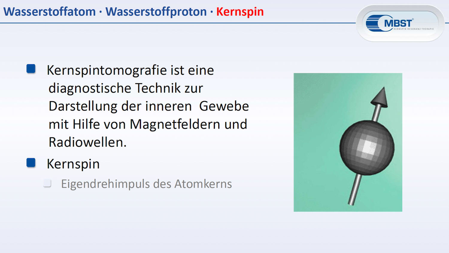 Die MBST Kernspinresonanz-Technologie ist eine therapeutisch genutzte Entwicklung aus der im MRT weltweit eingesetzten Kernspintechnologie. Sie basiert auf dem physikalischen Prinzip der Kernspinresonanz, bei dem Wasserstoffkerne zunächst Energie aufnehmen und anschließend zum Teil wieder an das umliegende Gewebe abgeben.