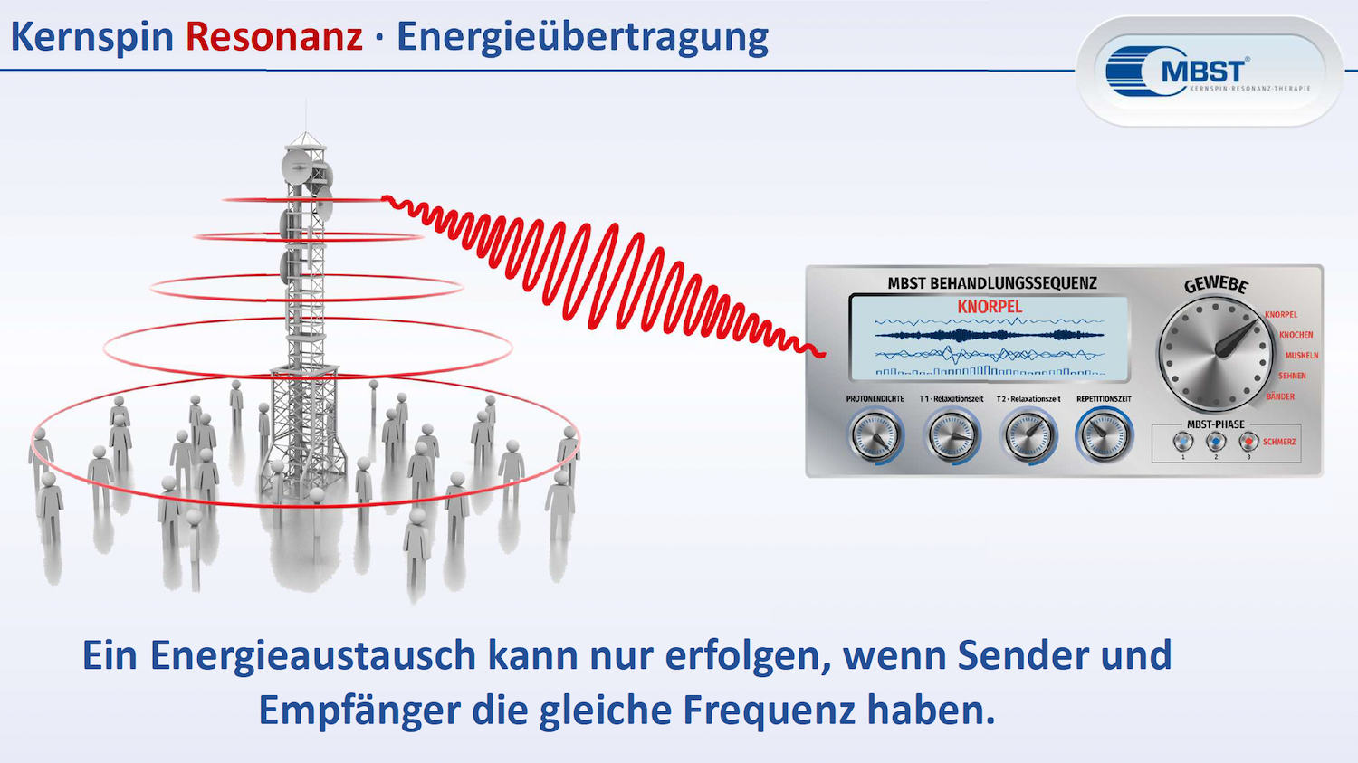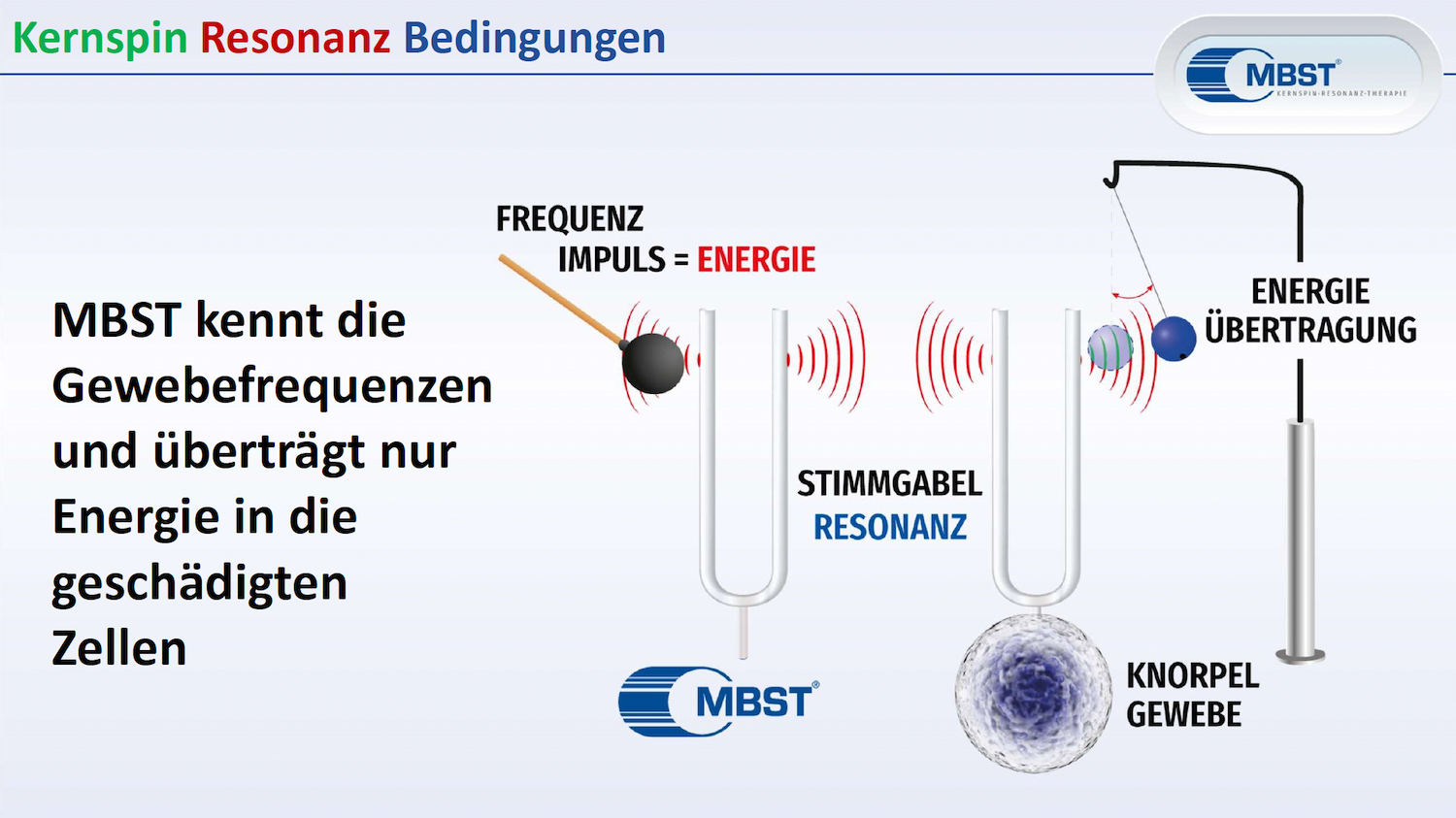 Die therapeutisch genutzte MBST Kernspinresonanz-Technologie nutzt, wie das MRT, den physikalischen Effekt des Kernspins, um Wasserstoffprotonen im Körper zu beeinflussen. Es werden aber keine Bilder erzeugt. MBST verfolgt mit der Energieübertragung in Protonen das Ziel, molekulare biophysikalische Prozesse in geschädigten oder funktionsgestörten Zellen auszulösen. Erfolgreich behandelte Patienten berichten, dass sich ihre Beschwerden durch die Therapie deutlich und langanhaltend reduziert haben.