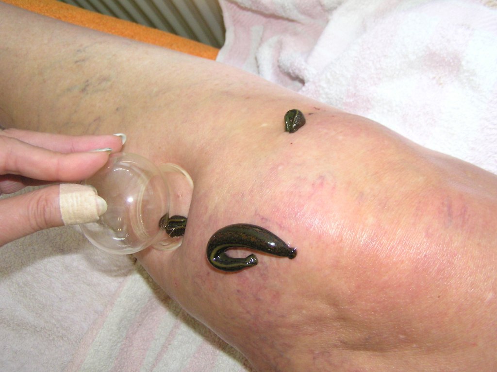 Gezielt werden noch heute Blutegel im Bereich der zu behandelnden Körperregion angesetzt. Beim Biss der Tiere gelangt der Speichel in den Körper. Er enthält Blutflussfördernde und Gerinnungshemmende Substanzen.